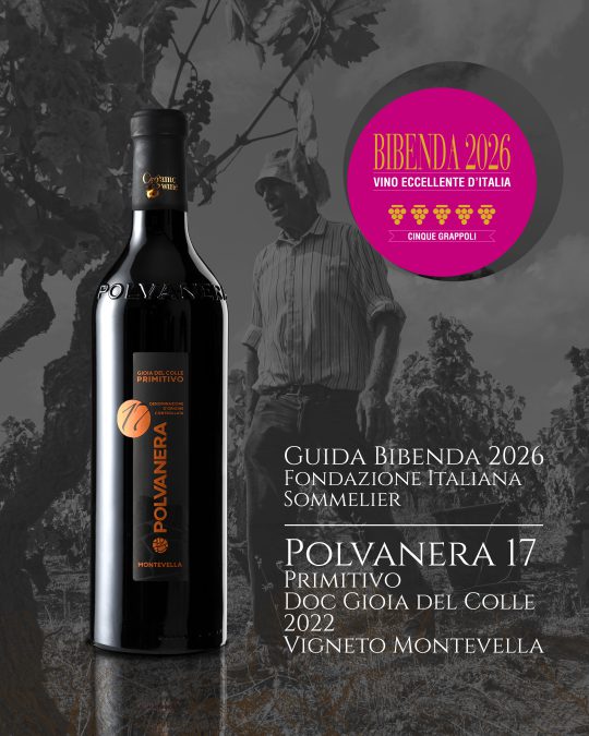 Il vigneto Montevella si distingue anche quest’anno! Con il massimo riconoscimento dalla guida Bibenda 2026 – Fondazione Italiano Sommelier, il nostro Polvanera 17 2022 – Primitivo DOC Gioia del Colle – Vigneto Montevella ha ricevuto il 5 Grappoli.