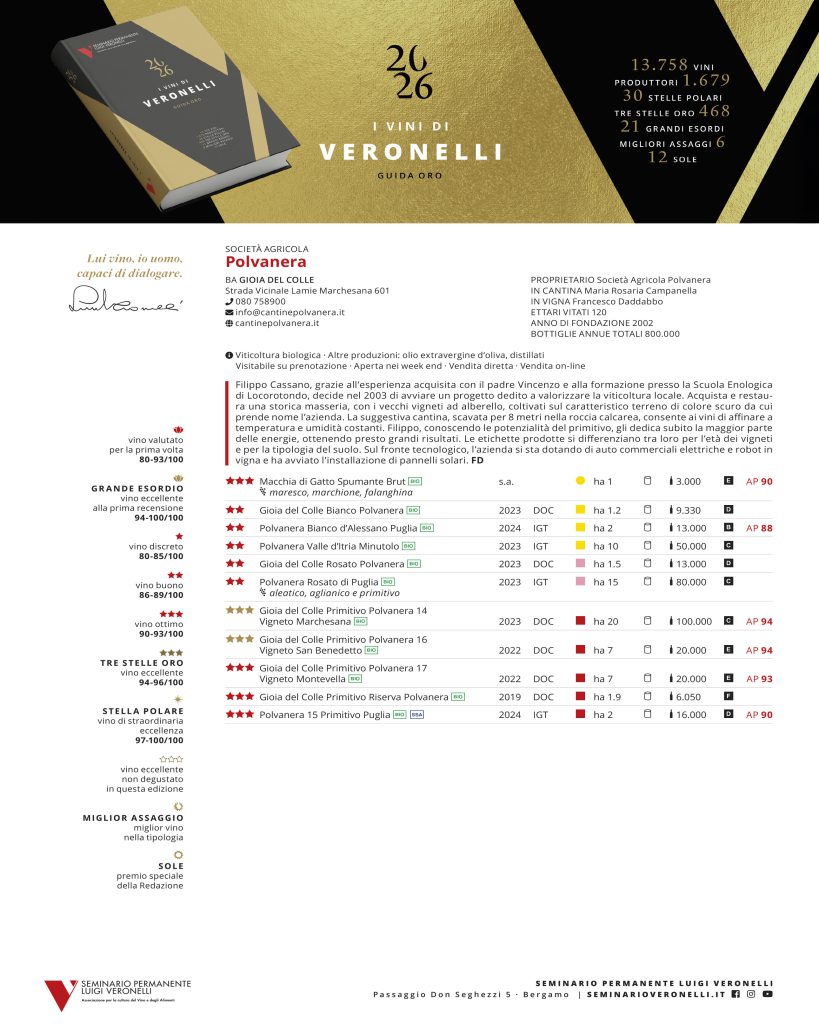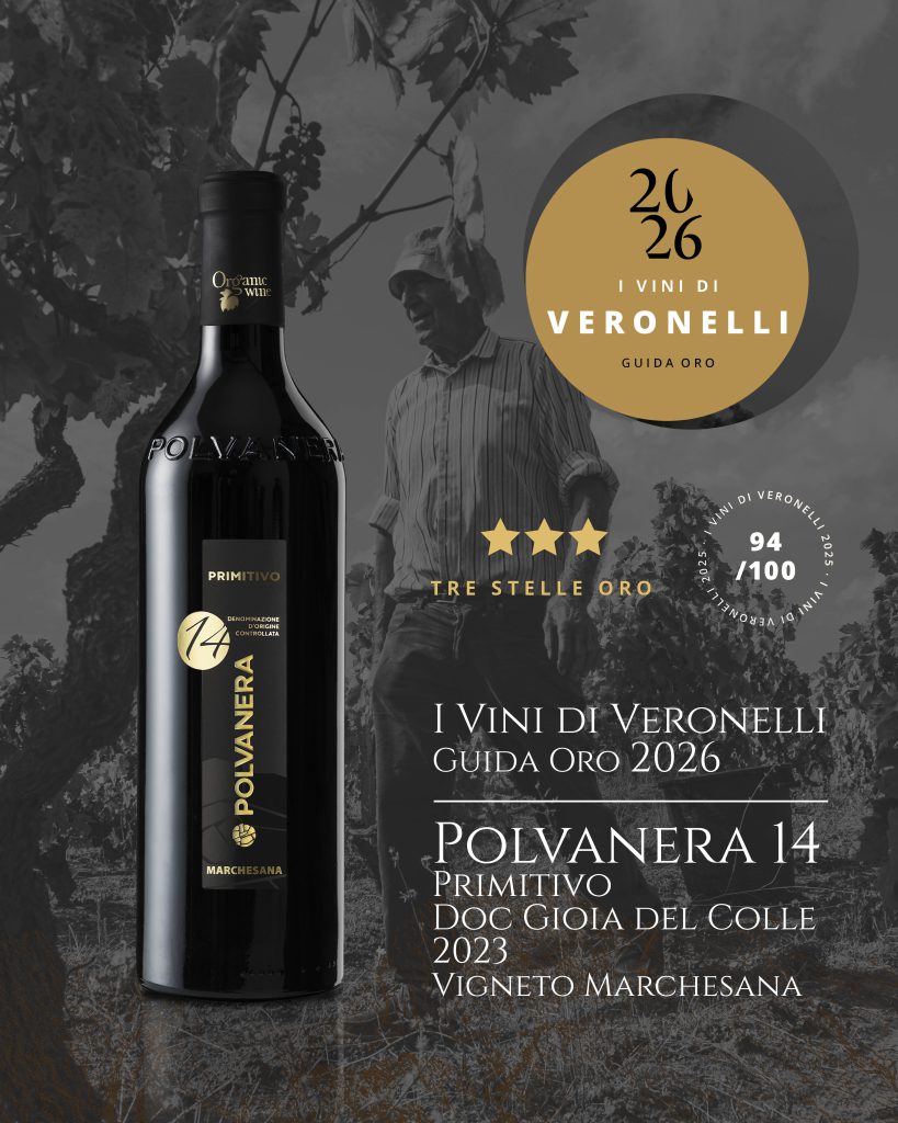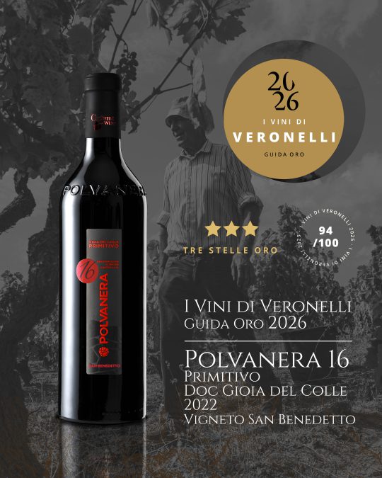 Le soddisfazioni non mancano qui in cantina! La guida oro “I vini di Veronelli 2026” ha premiato 2 dei nostri vini con il massimo riconoscimento. Tre Stelle Oro sia per il Polvanera 16 2022 Primitivo Doc Gioia del Colle – Vigneto San Benedetto e sia per Polvanera 14 2022 Primitivo Doc Gioia del Colle – Vigneto Marchesana entrambi con il punteggio di 94/100. Siamo molto affezionati a questi due vigneti, ci regalano un Primitivo di grande eleganza e siamo orgogliosi di prendercene cura.